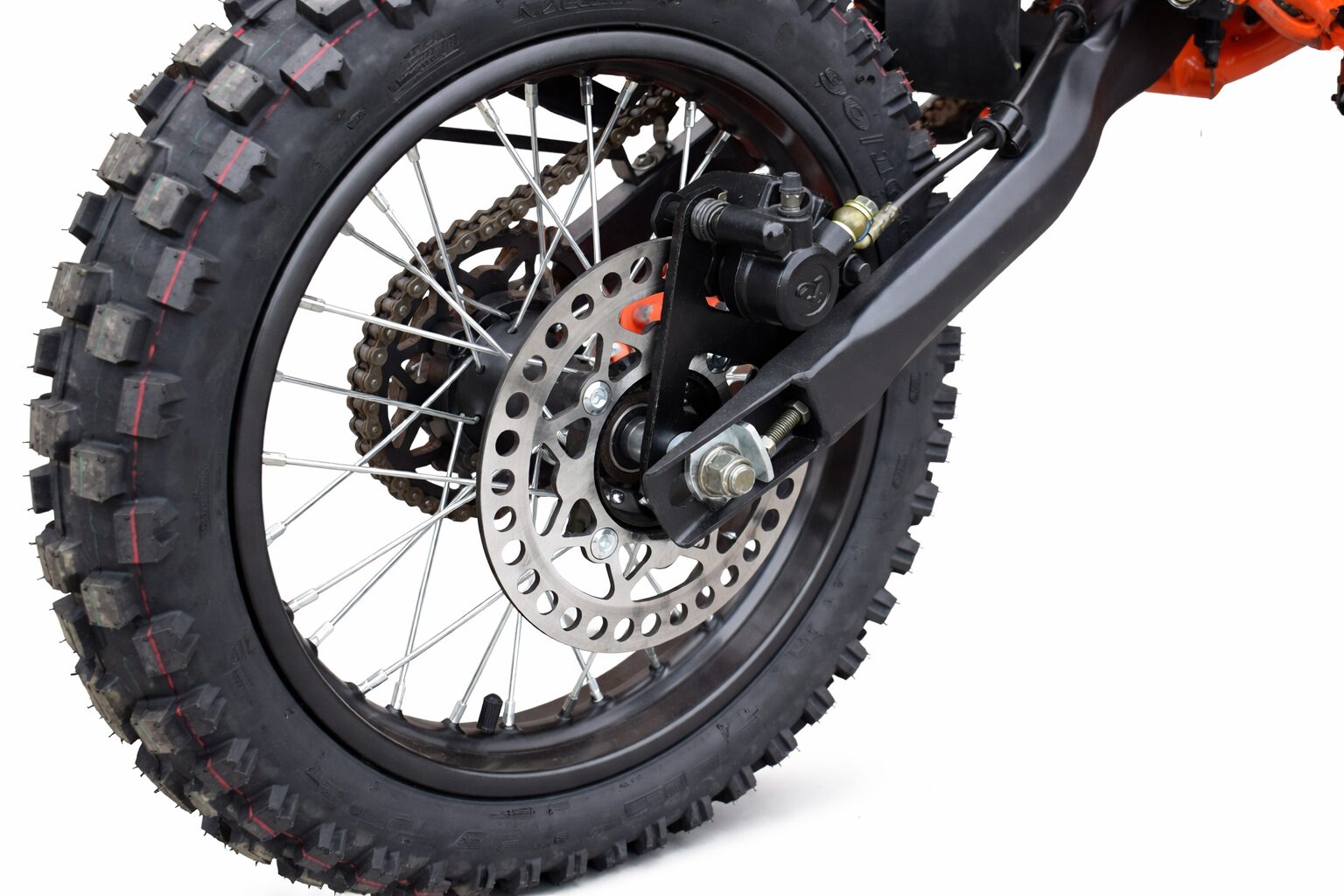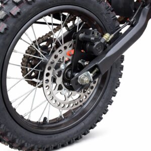 Motorka je osadená upside-down prednými tlmičmi a zadným nastaviteľným odpružením, čo zabezpečuje komfort a stabilitu pri jazde v teréne. Hydraulické kotúčové brzdy vpredu aj vzadu garantujú spoľahlivé brzdenie v každej situácii.